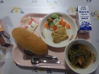 【コッペパン・牛乳・スプレッドチーズ・タンドリーチキン・ミニサラダ・野菜スープ・セレクトデザート】です。