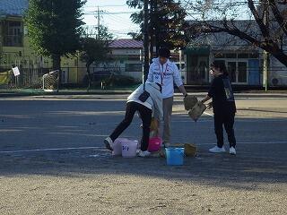 教職員は、朝7時に集合し、校庭の水たまりをスポンジで吸い取ったり、昨日できなかった機器や用具の準備をしたりしました。