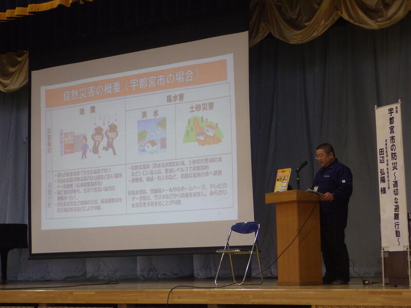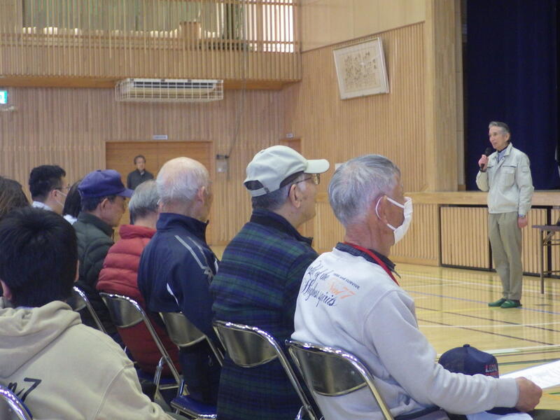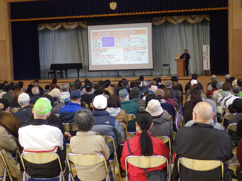 各自治会から、たくさんの方が集まりました。災害時の避難について、講話をいただきました。
