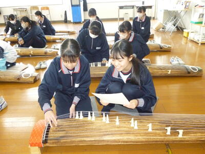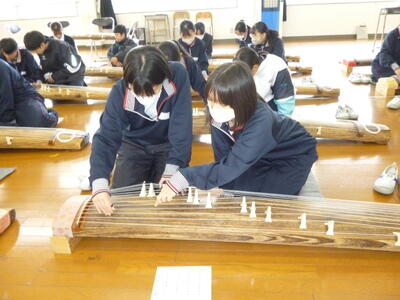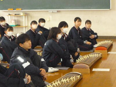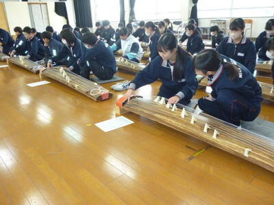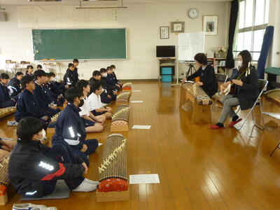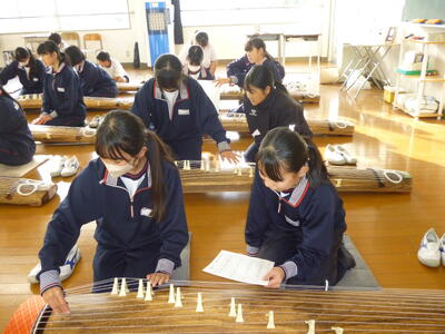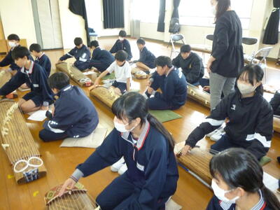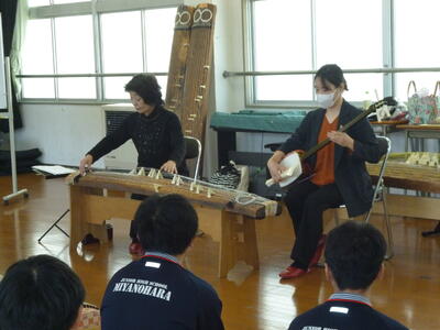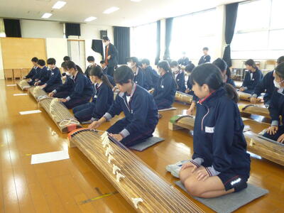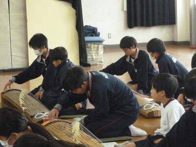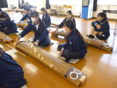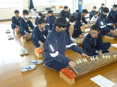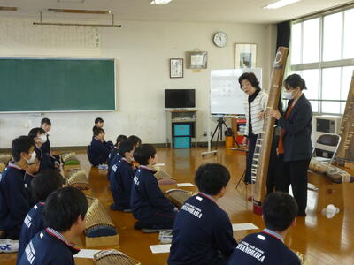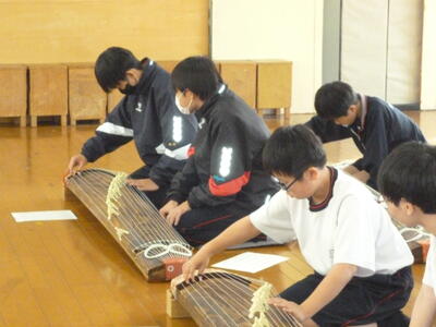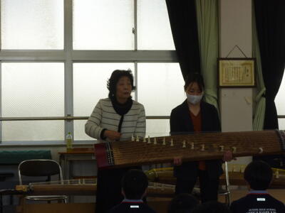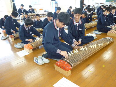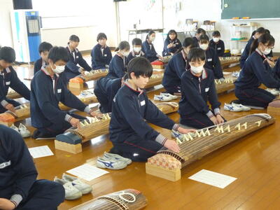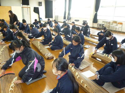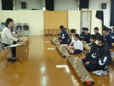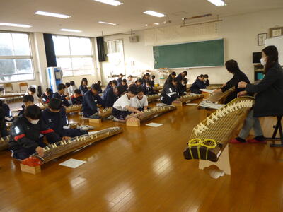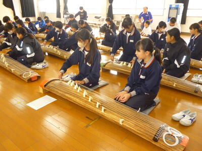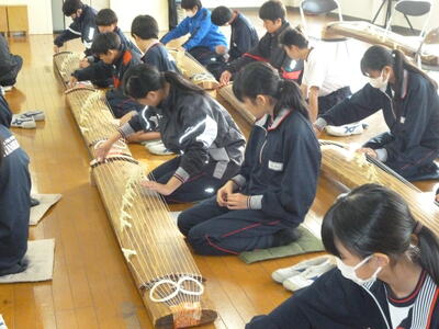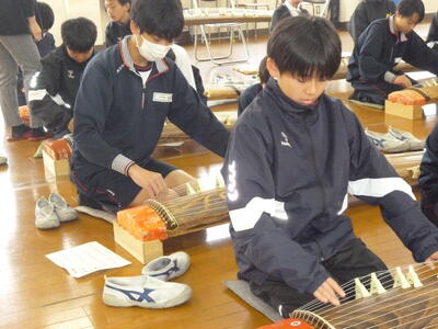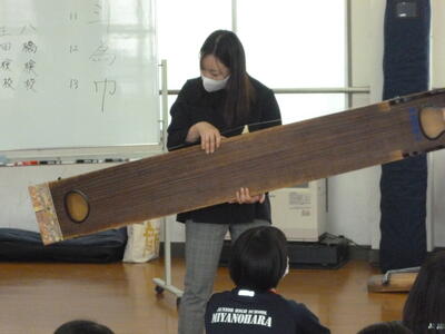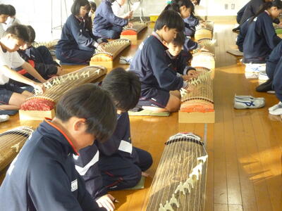 「ふれあい文化教室」では、日本の伝統的な楽器である箏の鑑賞と体験により、我が国の伝統文化について興味関心を高め、伝統音楽に親しもうとする心情を育てることを目標としています。