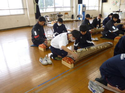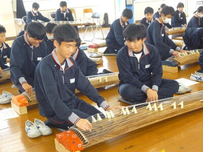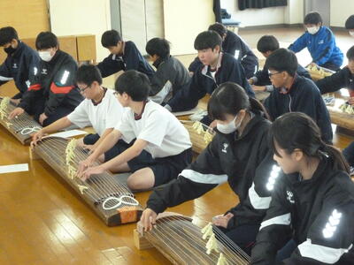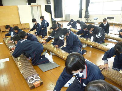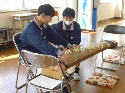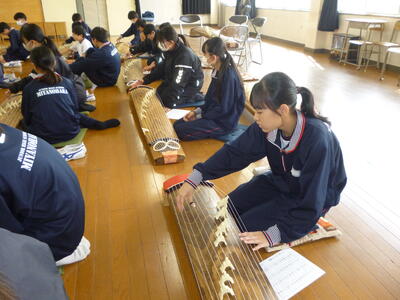 二人一組で、筝一面(こといちめん → 筝が一台あることを指します。)を使って練習します。