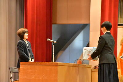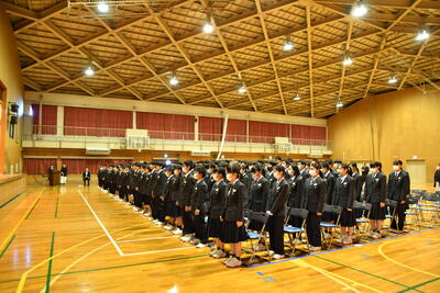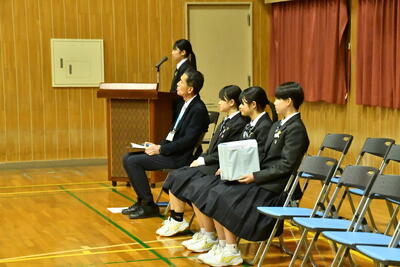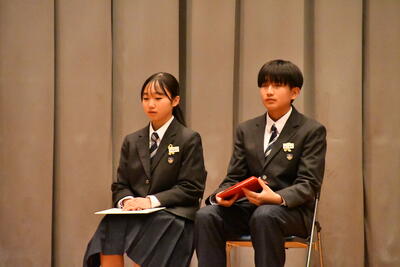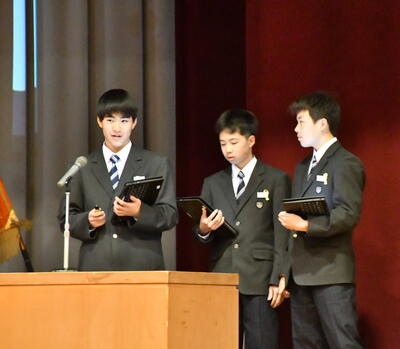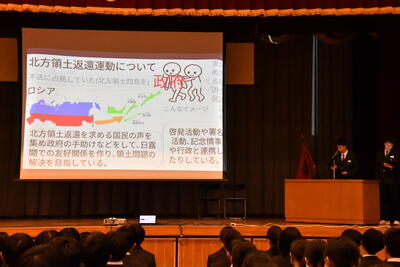 式の前には、今年度、「北方領土現地視察事業」の宮中生の代表として参加した、宇賀神さん(1組)、福田さん(2組)、川名さん(5組)の3人が、北方領土について発表しました。