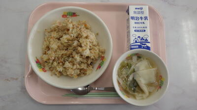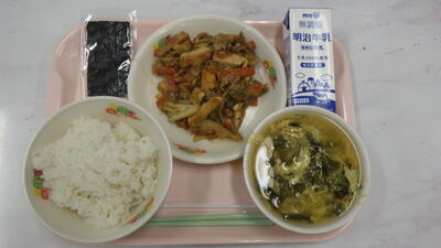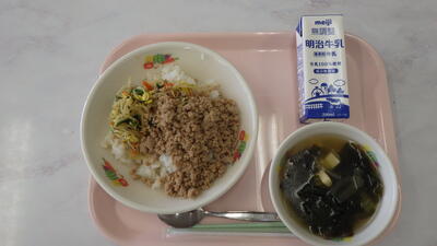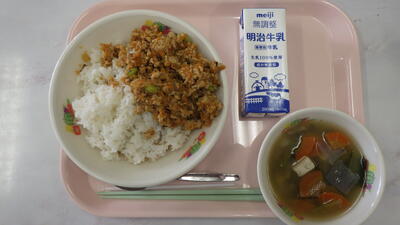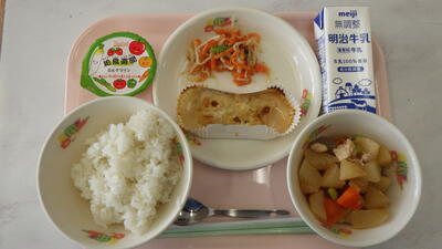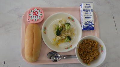 ※5月2日は宮の原小学校の創立記念日です。今年で創立56年目(55歳)を迎えました。旬の食材「たけのこ」をたくさん使ったちらし寿司,紅白はんぺんを用いたすまし汁とデザートのクレープで,創立記念日をお祝いしました。