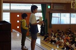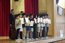 10月10日(金)に,第1学期終業式を行いました。初めに「宮っ子心の教育表彰」「読書感想文コンクール」の表彰を行い,14名の児童を表彰しました。次に,1学期に頑張ったことや2学期の目標などについて,2名の代表児童が素晴らしい作文を発表しました。最後に校長より,通知票の説明と1学期をよく振り返って2学期に臨んでほしい,ということについて話がありました。式に参加する態度が大変よかったです。