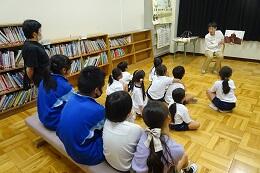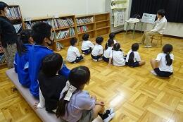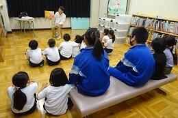 10月1日(水)に,第3日目の「お昼のおはなし会」を実施しました。宮っ子チャレンジで来校している中学生も一緒に参加し,子どもたちは楽しい本の世界に入り込んでいました。今回は,「うごいちゃだめ!」「バナナをかぶって」「うずまき」などの本を読んでいただいたり,本の内容を歌で歌ってくださったりしました。地域ボランティア様,ありがとうございました。