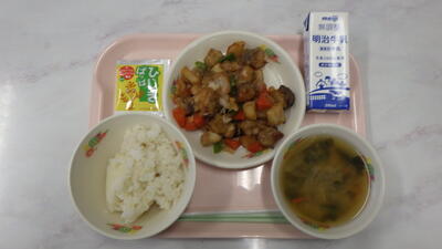 2月25日献立 投稿日時 : 14:18 宮の原小学校管理者 麦入りご飯 揚げ魚と野菜の和風和え みそ汁 ひじきぱっぱ 牛乳 {{options.likeCount}} {{options.likeCount}}