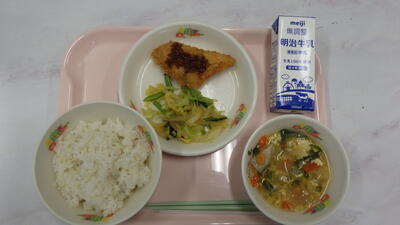 12月3日献立 投稿日時 : 12/05 宮の原小学校管理者 麦入りご飯 白身魚のチーズフライ さっぱりあえ にら玉汁 牛乳 {{options.likeCount}} {{options.likeCount}}