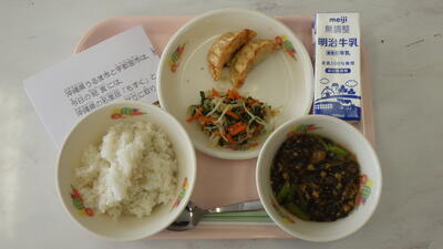 ※今日は宇都宮市と沖縄県うるま市のコラボ給食です。うるま市の特産品の「もずく」と,宇都宮市でたくさん消費されている「餃子」を,献立に取り入れました。