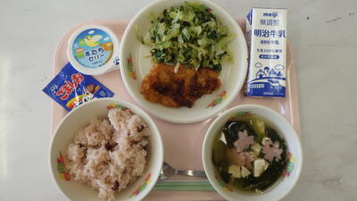 3月11日 卒業お祝い献立 投稿日時 : 15:35 宮の原小学校管理者 赤飯 ヒレカツ 磯辺和え 紅白すまし汁 すだちゼリー ごましお 牛乳 {{options.likeCount}} {{options.likeCount}}