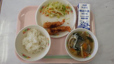 3月12日献立 投稿日時 : 15:38 宮の原小学校管理者 麦入りご飯 エビフライ ボイルキャベツ 吉野汁 牛乳 {{options.likeCount}} {{options.likeCount}}