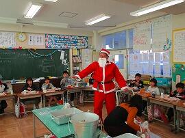 12月23日(月)の給食の時間に,一足早くサンタさんからプレゼントが届きました。子どもたちが楽しみにしていたクリスマスのデザートです。各クラスともサンタさんの登場に歓声があがっていました。
