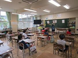 19日(火)分散登校の2日目でした。あいにくの雨の中でしたが,子どもたちは元気に登校してきました。教室内では密にならないように気を付けながらも,昨日と同様に久しぶりに友達と会えたことを喜ぶ様子が見られました。雨天のため登校班編成を室内で行いましたが,1年生の保護者の皆様には確認のためご来校いただき感謝しております。おかげさまで,来週の分散登校からは,どの班もそろって登校することができます。ありがとうございました。