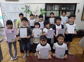 先日行われたウォークラリー大会の表彰式を実施しました。今回は,体育館に集まることができなかったため,放送での結果発表,上位3班のみ校長室で表彰式という形を取りました。どの班も賞状を手に,嬉しそうにしていました。これからも班の絆を大切にし,仲良く過ごしてもらいたいと思います。