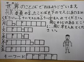 今日から1週間,あいさつ強化週間を実施しています。今回のテーマは,「世界の言葉でおはようございます」です。日替わりで5つの言語の「おはようございます」の意味の言葉を使って,代表委員があいさつをします。子供たちは,事前に配付された用紙にその日の言葉を記入します。すると,最後にあるキーワードが出てきて,それを図書室に持っていくと,貸出冊数がアップします。