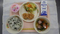 ちが大好きなからあげ,すまし汁には,桜の形をしたかまぼこが入っていました。給食当番の子供たちも上手に着替