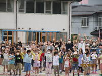 終わった後は,ホッとして笑顔でドローンに手を振っていました。続いての集合写真もみんな素早く並んで撮影する