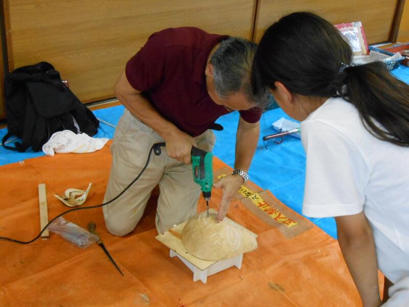 「宮っこ伝統文化体験教室」が行われ,6年生がふくべ細工を体験しました。講師は,ふくべ洞の小川様はじめ3名の皆様。体育館にブルーシートを敷いて,全員が思い思いに,オリジナルの作品づくりに熱中していました。