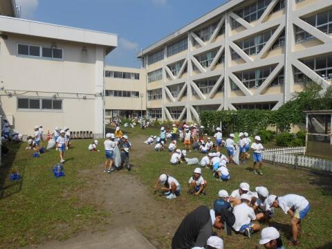 学年・学級ごとに割り当てられた場所の除草作業を,2校時を使って全校生で行いました。よく晴れた今日は日射しが強く,日なたでの作業は大変でしたが,皆よく働いたお陰で随分すっきりとしました。目に見える環境整備は,落ち着いた学校生活や学習に集中して取り組む上で大切です。