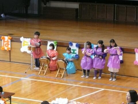 ▼動物の物まねクイズも行いました。左がウサギ,右がカメだそうです。演技は子どもたちが一生懸命に考えました。