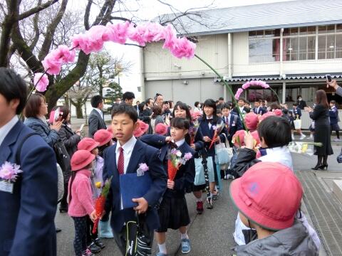 式の終了後には降り続いた雨も上がり、予定通りに屋外で歓送することができました。花のアーチを潜り抜けた後も、しばらく記念写真を撮る光景が続きました。