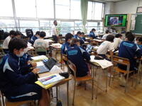 2学年:クロムブックを使い、瑞中クイズを全員で解きました。「瑞穂野村の最後の村長は?」「校歌の作者は?」などの問題から、これから行うスキー教室に関する問題まで、三択でしたが、100%正解するのはなかなか難しいようでした。