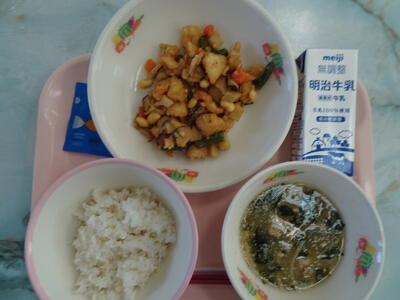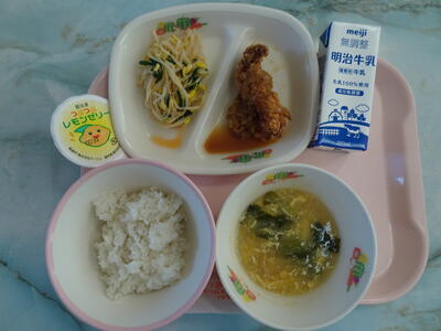 油淋鶏・大豆もやしのキムチ和え・中華コーンスープ・レモンゼリー・麦入りご飯・牛乳