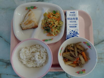 赤魚粕漬・五目きんぴら・ごま和え・麦入りご飯・牛乳