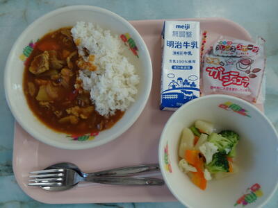 トマトカレー・ゆで野菜・ガトーショコラ・麦入りご飯・牛乳
