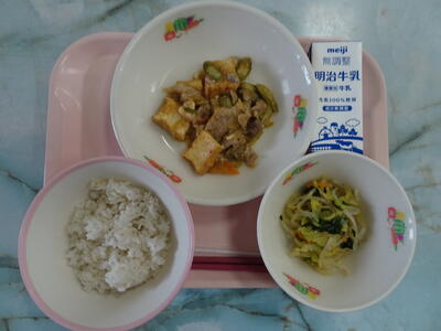 生揚げと豚肉の豆板醤炒・おひたし・麦入りご飯・牛乳