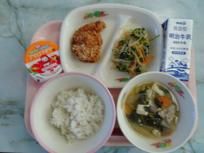 鶏肉の唐揚げ・からし和え・豚汁・麦入りご飯・牛乳・アセロラゼリー
