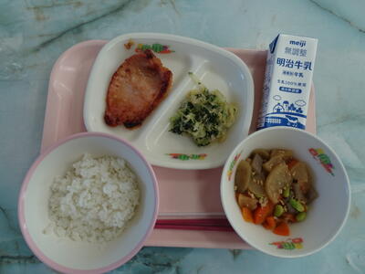 豚肉の味噌漬焼き・ごま酢和え・大根とこんにゃくの炒め煮・麦入りご飯・牛乳