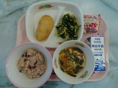 赤飯・磯辺和え・ささみチーズフライ・にら卵トマトみそ汁・薩摩芋と栗のタルト・牛乳