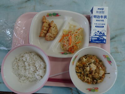 マーボー豆腐・バンサンスー・揚げ餃子・牛乳・麦入りご飯