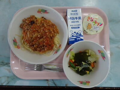 大豆ミート入り肉みそソーススパゲティー・海藻サラダ・きなこプリン・牛乳