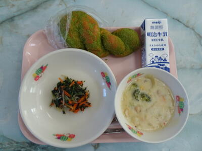 抹茶揚げパン・牛乳・コーンシチュー・海苔いっぱいサラダ・チーズ