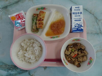竹輪二色揚げ・大根おろし・高野豆腐の煮物・麦入りご飯・牛乳・ふりかけ