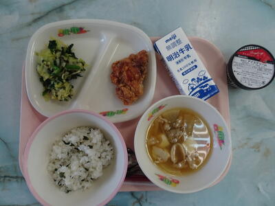鶏肉の唐揚げ・磯辺和え・みずほの豚汁・麦入りわかめご飯・牛乳・アイスクリーム