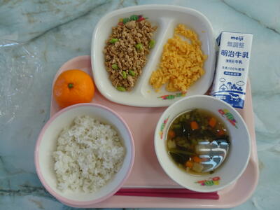 二色丼・牛乳・みかん・蕪とじゃが芋のあられ汁