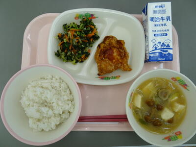 鶏肉のから揚げ,磯辺あえ,なめこ汁,麦入りご飯,牛乳
