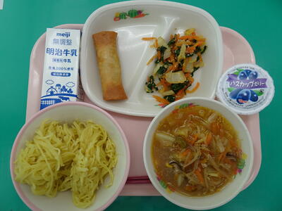 野菜味噌ラーメン,春巻き,ナムル,ハスカップゼリー,牛乳
