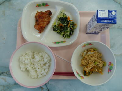 南瓜そぼろあんかけ・鶏のごま味噌焼き・ニラのごま和え・牛乳・麦入りご飯