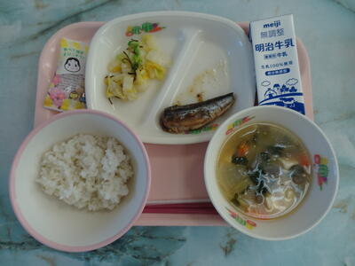 鰯おかか煮・味噌けんちん汁・白菜の塩昆布和え・麦入りご飯・牛乳