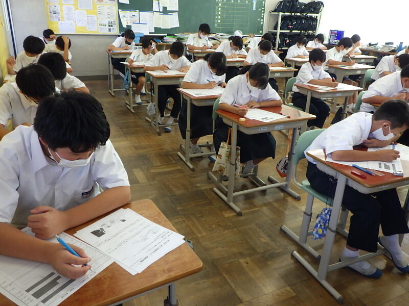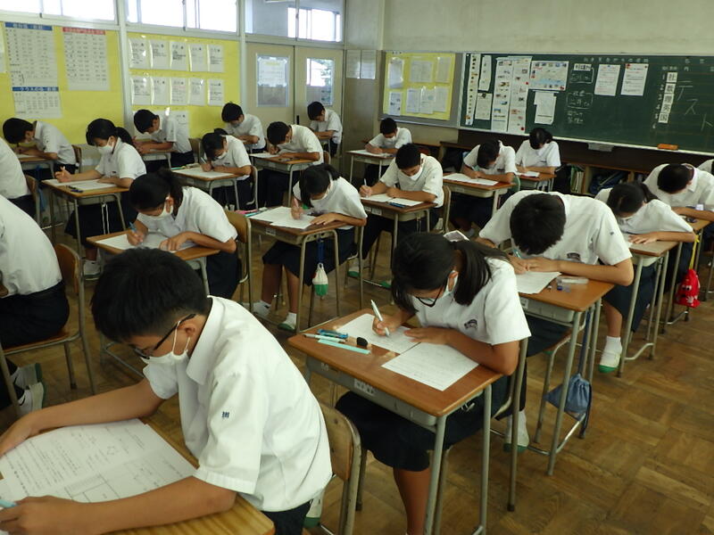 2年生は理科のテスト中でした。テストの心得を守って真剣に受けています。