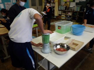 今日の授業は、牛乳パックをリサイクルして、紙すきを行いました。