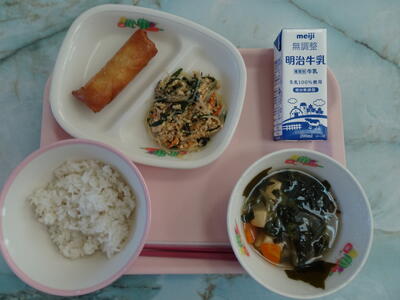 春巻・にらと春雨の炒め物・小松菜と豆腐のスープ・麦入りご飯・牛乳