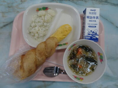 きなこ揚げパン・粉ふき芋・白菜スープ・オムレツ・牛乳