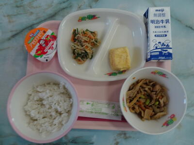 プルコギ風炒め物・青梗菜と豆腐のスープ・目の愛護ゼリー・麦入りご飯・牛乳