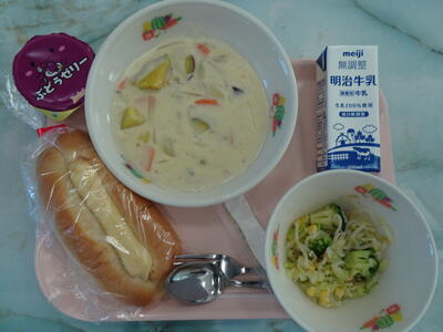 さつま芋のシチュー・ゆで野菜・チーズパン・牛乳・ぶどうゼリー