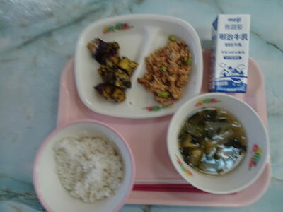 豚肉のしょうが焼き,からし和え,干瓢の味噌汁,ご飯,牛乳