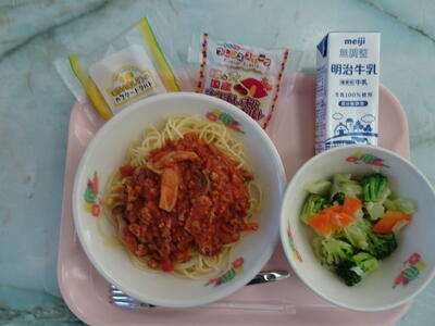 秋のミートソーススパゲティ・ゆで野菜・セレクトタルト・牛乳